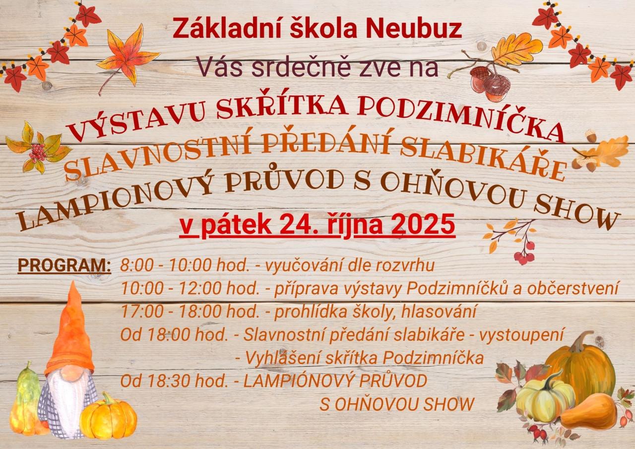Srdečně zveme všechny na VÝSTAVU SKŘÍTKA PODZIMNÍČKA + SLAVNOSTNÍ PŘEDÁNÍ SLABIKÁŘE + LAMPIONOVÝ PRŮVOD S OHŇOVOU SHOW v pátek 24.10.2025 od 17:00 hodin.